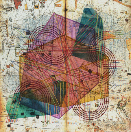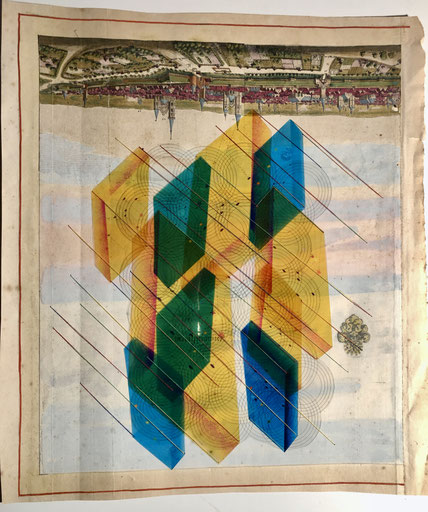 Collagenmischtechnik ( Garn, Folie, Papier ) auf einem alten bemalten Druck der Stadt Braunschweig