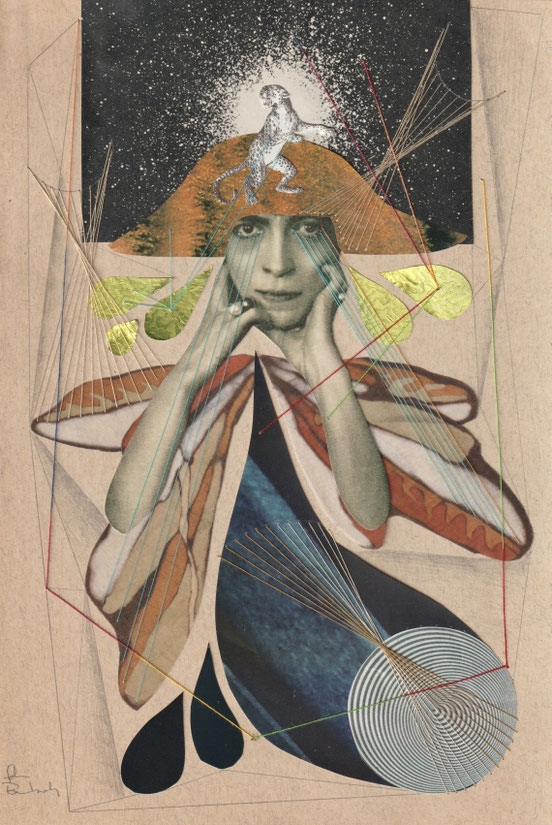 Collagenmischtechnik ( Garn, Papier, Gilb) auf Papier